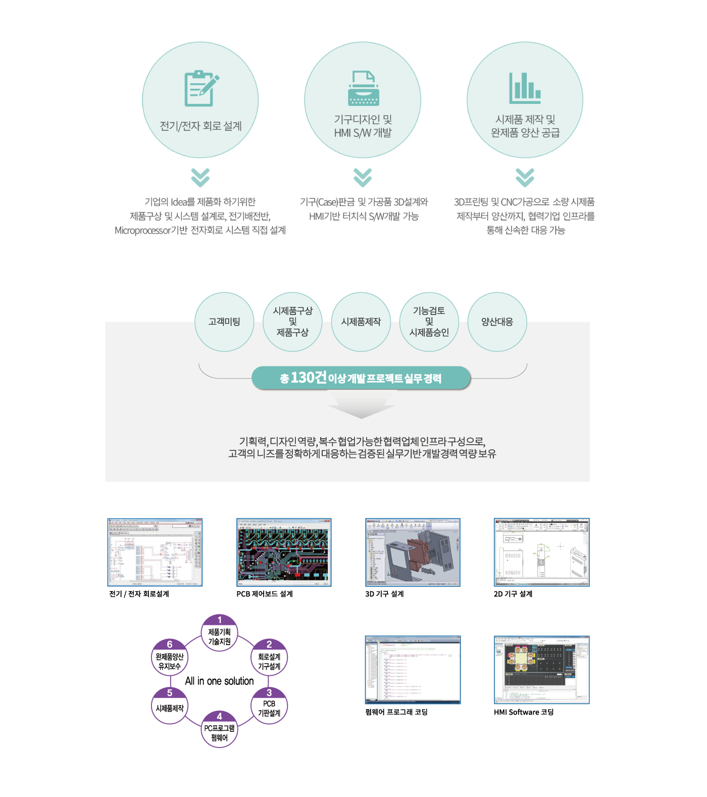 고객의 Idea와 Needs를 제품 구상부터 개발, 시제품제작, 완제품 양산까지 일괄 가능한 All in one solution을 실현합니다.